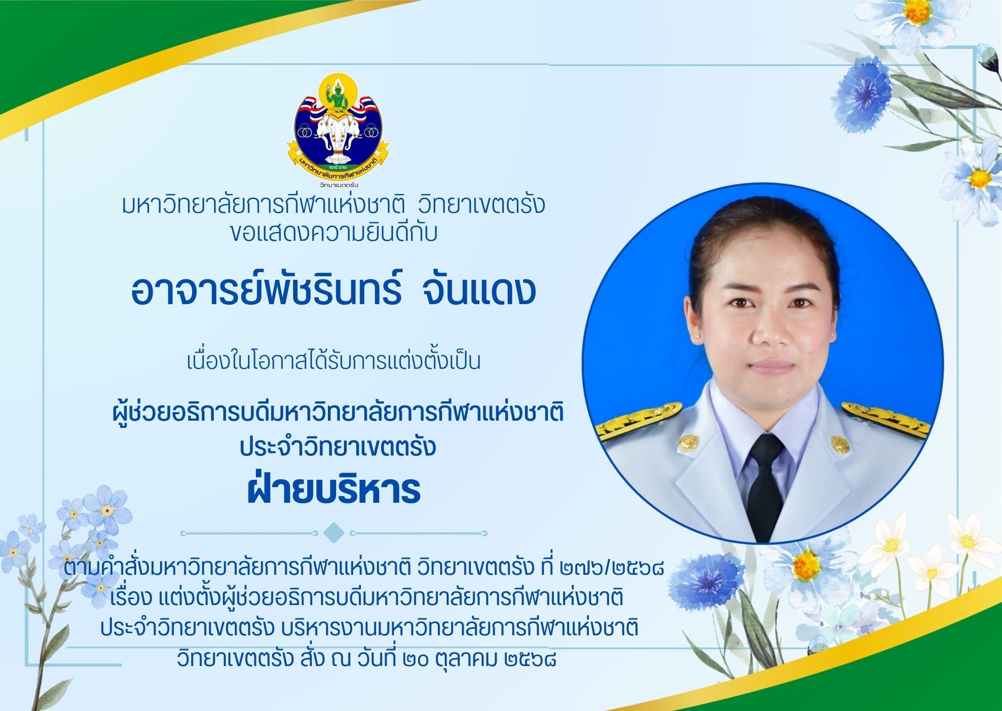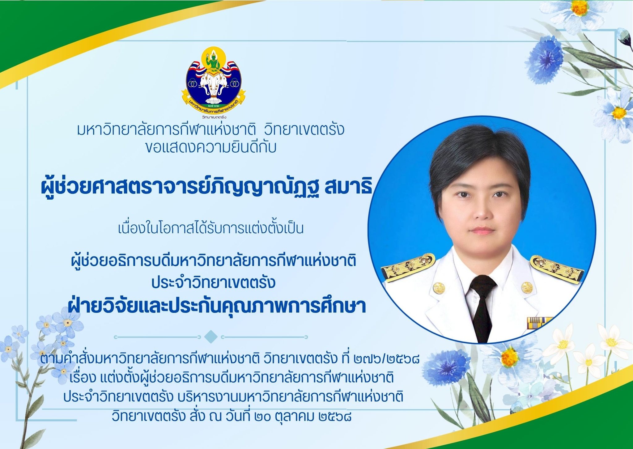 อาจารย์ภัทรวดี อ่อนเอกสิทธิ์ อาจารย์คณะศิลปศาสตร์ สาขาการบริหารจัดการกีฬา มหาวิทยาลัยการกีฬาแห่งชาติ วิทยาเขตตรัง เข้าร่วมการนำเสนองานวิจัยด้วยวาจา (Oral Presentation) ในหัวข้องานวิจัย "Managemient Approaches for การนำเสนองานวิจัยด้วยวาจา (Oral Presentation) ในหัวข้องานวิจัย "Managemient Approaches for Driving Trang Province Towards a Sports City" 2025 Asian Association for Sport Management (AASM) Conference. ระหว่างวันที่ 22-23 สิงหาคม 2568 ณ สาธารณรัฐจีน (ประเทศไต้หวัน) คลิกเพิ่มเติม.... |