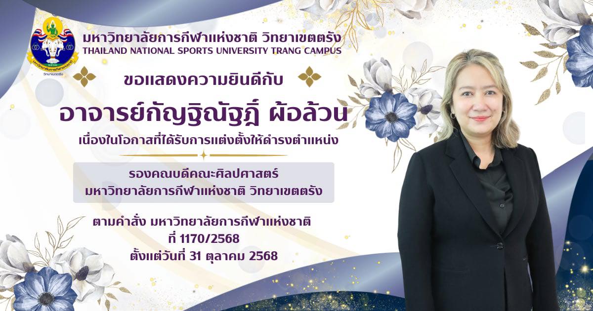 ผู้ช่วยศาสตราจารย์ภิญญาณัฏฐ สมาธิ รองคณบดีคณะศิลปศาสตร์ พร้อมด้วยอาจารย์และบุคลากรคณะศิลปศาสตร์ ร่วมแสดงความยินดีและต้อนรับ ผู้ช่วยศาสตราจารย์ ดร.วงศ์พัทธ์ ชูดำ รองอธิการบดีมหาวิทยาลัยการกีฬาแห่งชาติ ประจำวิทยาเขตตรัง เนื่องในโอกาสที่ได้รับการแต่งตั้งให้ดำรงตำแหน่ง รองอธิการบดีมหาวิทยาลัยการกีฬาแห่งชาติ ประจำวิทยาเขตตรัง ตั้งแต่วันที่ 1 ตุลาคม พ.ศ. 2568 เป็นต้นไป คลิกเพิ่มเติม... |